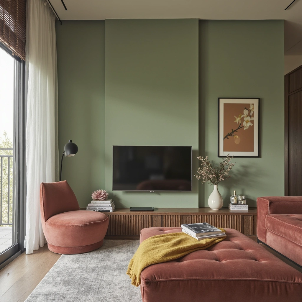 Place your sofa or media center against the accent wall, and use lighter sage or neutral tones on the other walls to balance the depth. To complement this, choose furniture in natural wood tones or black metal frames for contrast.