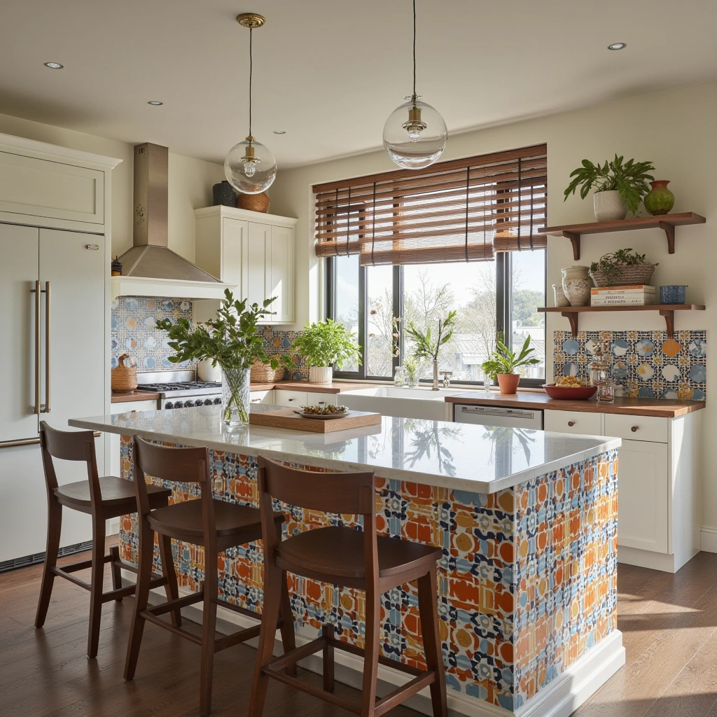 Inject personality with a kitchen island featuring vibrant tile patterns on the base and seating on two sides. This approach is perfect for eclectic or boho-style kitchens.