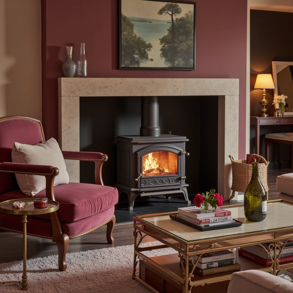 - Furniture: Neutral furniture to balance the bold stove.